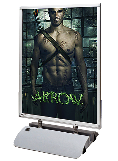 Ett rejält skyltställ i 100×140 cm format. Plastfot som man fyller med sand eller vatten.